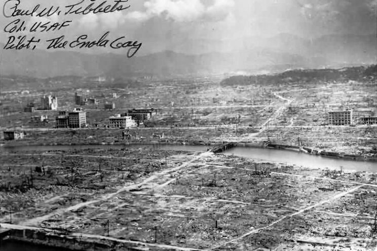 Zniszczona Hiroszima z podpisem pilota bombowca "Enola Gay" Paula Tibbetsa/ własność publiczna