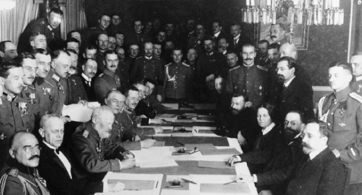 (…) W końcu 3 marca podpisano w Brześciu tzw. traktat brzeski między Rosyjską Federacyjną Republiką Sowiecką i militarnym blokiem Trójprzymierza: Cesarstwem Niemieckim, Monarchią Austro-Węgierską, Królestwem Bułgarii i Imperium Osmańskim. Nieco wcześniej (9 lutego) osobny traktat podpisały państwa centralne ze specjalnie zaproszoną delegacją Ukraińskiej Republiki Ludowej.