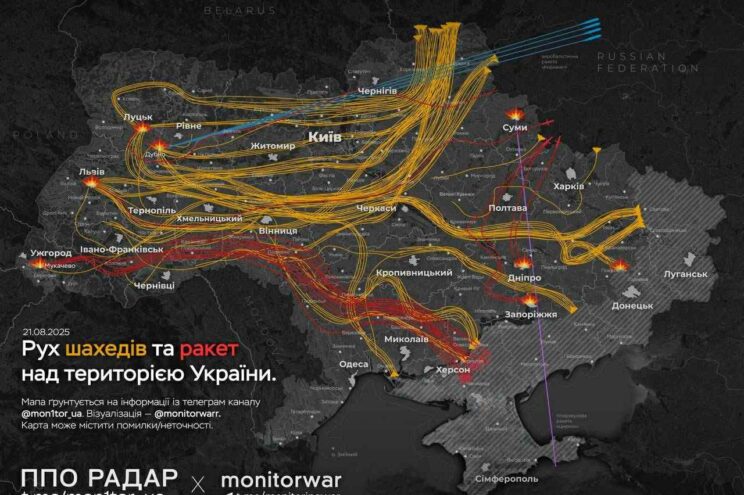 Z oficjalnych danych Sił Zbrojnych Ukrainy wynika, że w nocy z 20 na 21 sierpnia armia rosyjska wystrzeliła na Ukrainę 574 drony oraz 40 rakiet, w tym balistyczne i manewrujące.